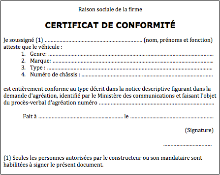 13. « certificat de conformité » : le document établi délivré par le constructeur afin de certifier qu'un véhicule satisfaisait à tous les actes réglementaires au moment de sa production.