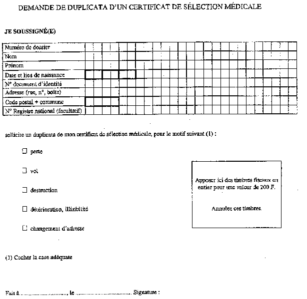 La demande de duplicata d'un certificat de sélection médicale visée à l'article 85 du même arrêté est conforme au modèle qui figure à l'annexe 12.