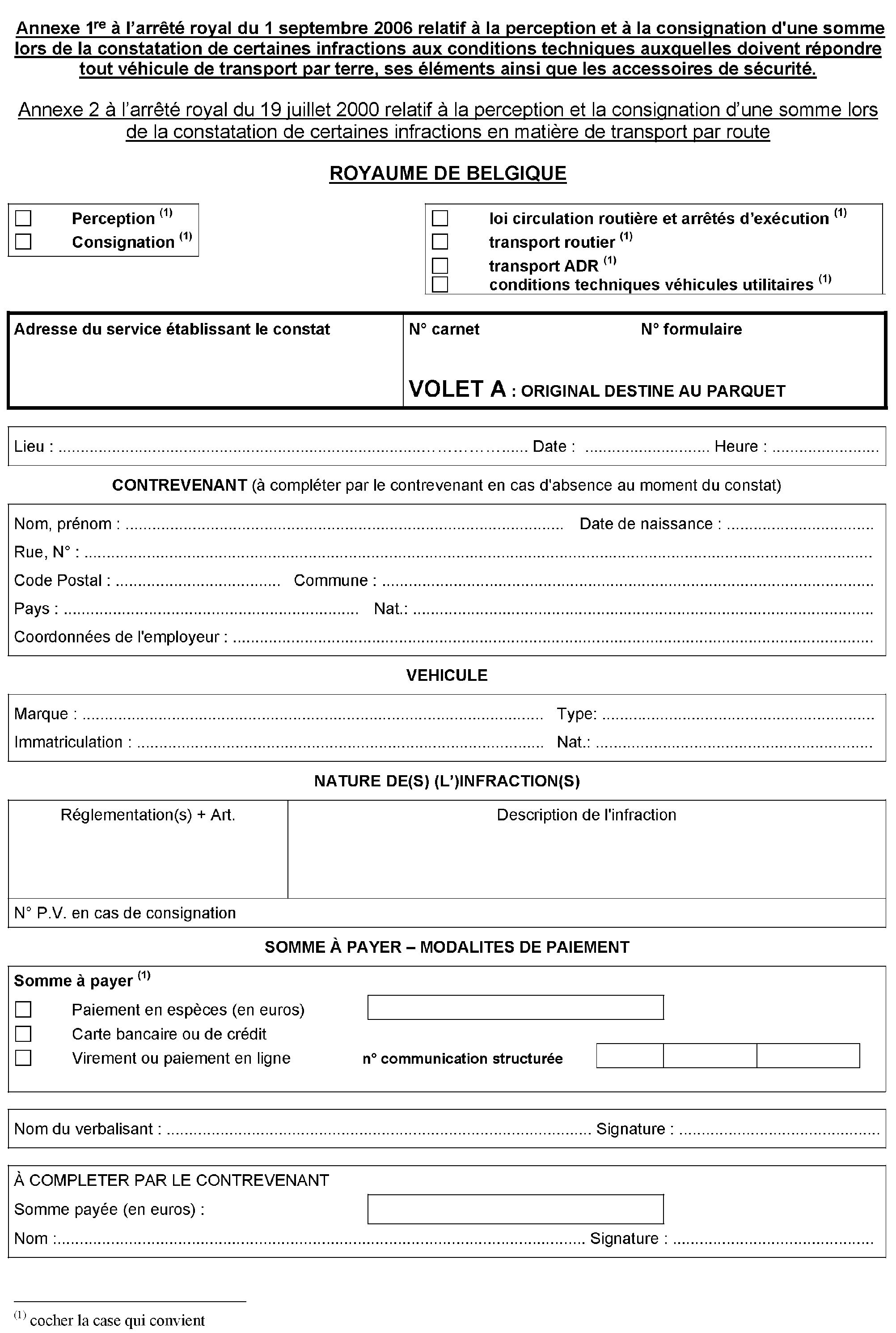 § 1er. En cas de perception, il est fait usage de formulaires numérotés réunis en carnets numérotés et conformes au modèle repris en annexe 2 de l'arrêté royal du 19 juillet 2000 relatif à la perception et à la consignation d'une somme lors de la constatation de certaines infractions en matière de transport par route. Lorsque plusieurs infractions sont constatées en même temps à charge d'un même contrevenant, celles-ci doivent être mentionnées sur le même formulaire.