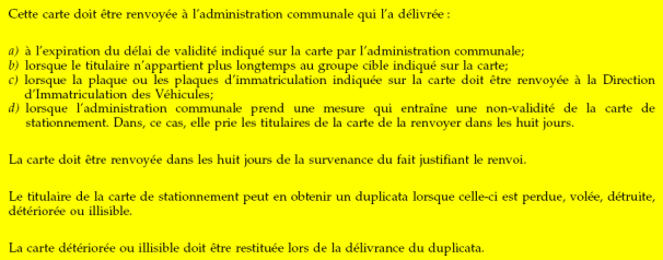 Le titulaire de la carte communale de stationnement peut en obtenir un duplicata si la carte est perdue, détruite, détériorée ou illisible. La carte détériorée ou illisible est renvoyée lors de la délivrance du duplicata.