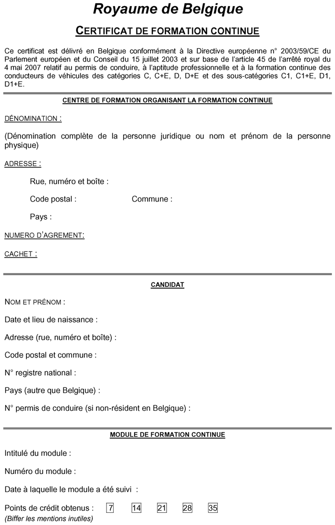 - Annexe 1re. Certificat d'aptitude professionnelle valable pour le transport de voyageurs effectué par des conducteurs qui ne possèdent pas de permis de conduire belge ou européen.