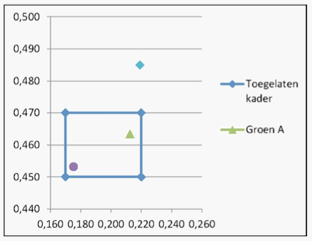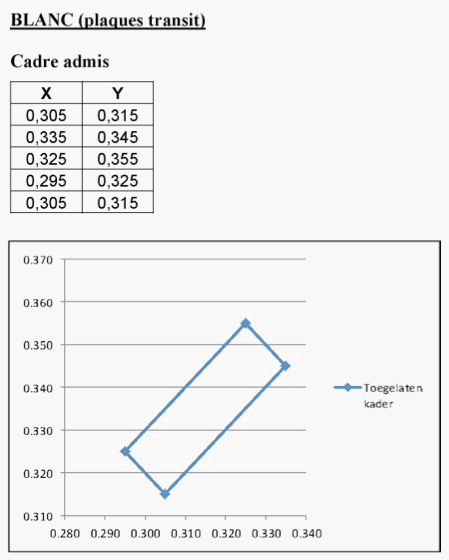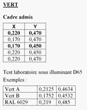 2.2.2. Vérification de la correspondance des caractéristiques colori-métriques avec les spécifications reprises dans le tableau 2 de l'annexe 3 de l'arrêté ministériel du 23 juillet 2001 relatif à l'immatriculation de véhicules.